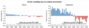 The graphs below displays for each year between 1979 and 2021 the extent of Arctic sea ice in March (the month when it is most extensive) and September (when it is least) compared with the average extent of the sea ice in those months during the reference period 1991-2020. The percentage variation from the average is the ‘anomaly’ - blue indicates more ice than average, red less.