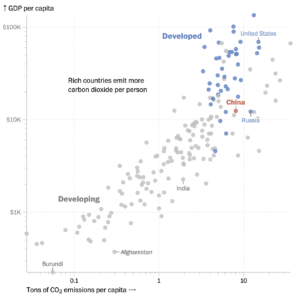 The association between a country’s GDP per person and CO2 emissions per person stands out like a sore thumb in the next graph. Australia is the blue dot immediately below the USA. In 2021 we had a population of 25.8 million, CO2 emissions per person of 15.2 tons and GDP per person of US$60,190. The figures for Niger and Madagascar, with very similar population sizes to us, were 0.1 tons and US$500-600 per person. If you go to the hyperlink, you can hover over the graph to explore the details for each of the countries.