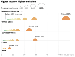 India is the poorest country shown and the one with the lowest average emissions per person, but even in India emissions per person clearly increase with wealth, although their richest decile’s emissions would be in the middle of the other countries’ ranges. The USA’s poorest 10% has higher emissions per person than all of India except for the richest 10%.