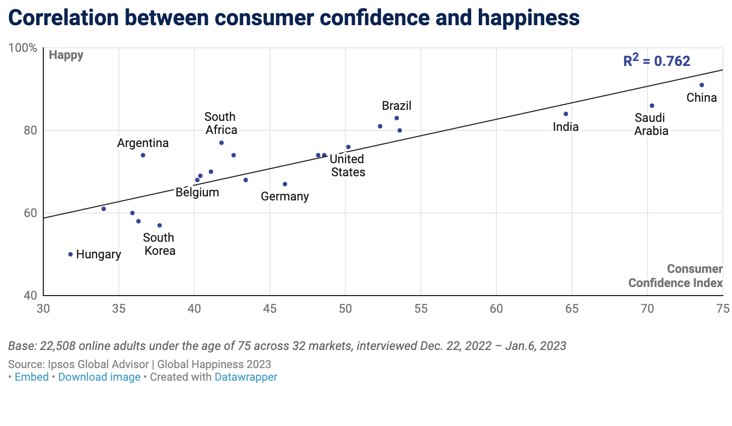 Another key finding from this study is that, at a local level, levels of happiness tend to reflect levels of consumer sentiment. Ipsos compared the percentage of happy adults and Ipsos’s Consumer Confidence Index across the 22 markets where both were measured in the same survey and found they are highly correlated. The Consumer Confidence Index tracks people’s sentiment about their financial situation, their ability to make purchases and investments, and perceptions of their local economy, job security and future opportunities.