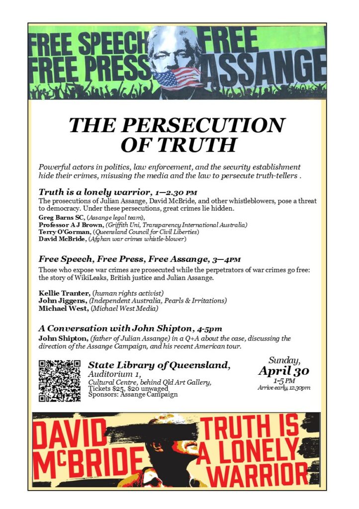 The war on whistleblowers, WikiLeaks and truth will be examined at a conference called The Persecution of Truth at the State Library of Queensland on Sunday April 30th.