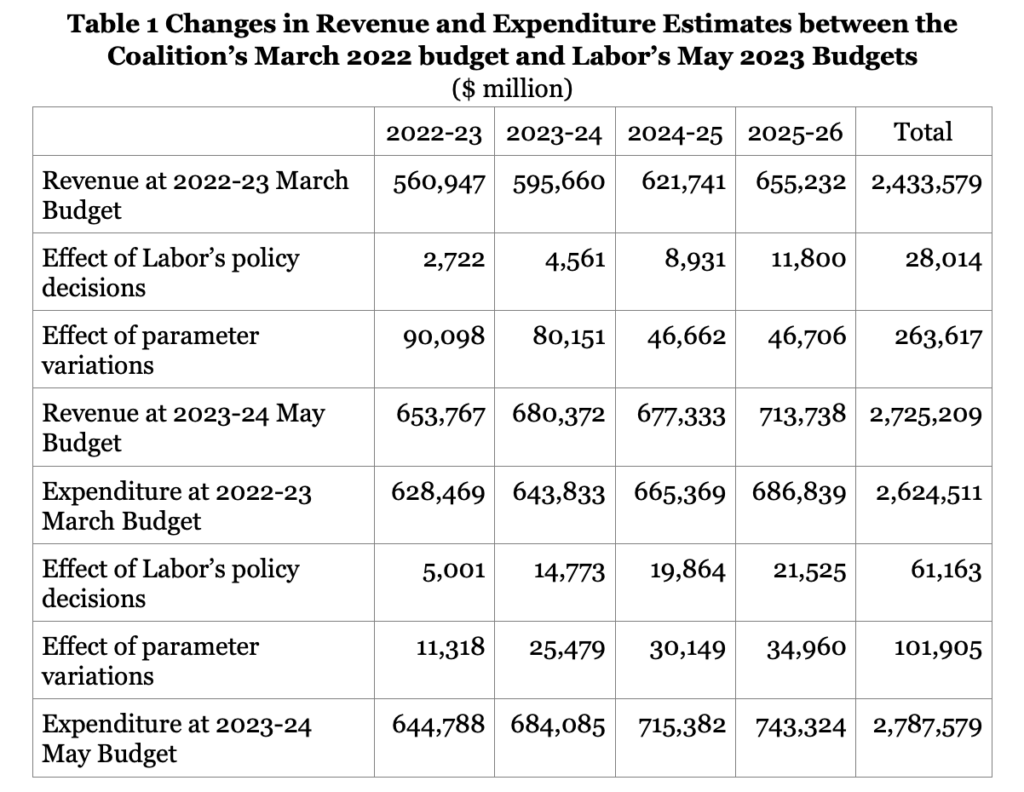 So, without the parameter variations affecting both revenue and expenditure, which essentially reflect revisions to the forecasting assumptions, the budget deficit in 2023-24 would have increased by $54.7bn. That is equivalent to an increase in the forecast underlying budget deficit from 0.5% of GDP to 2% of GDP, or alternatively expenditure would have been that much less.