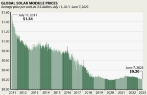 People had got used to the price of solar panels plummeting over the previous ten years, so it was a bit of a shock when prices started to increase during Covid due to temporary bottlenecks in the supply of silicon from China, the world’s major source. Normal service has now been resumed with prices falling steadily since late 2021 and they are now back to their nadir in mid 2020.