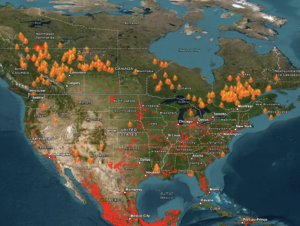 I imagine that everyone is aware of the devastating wildfires currently raging across much of North America – including the USA and Mexico, not just Canada – and the resulting air pollution. The map below is a snapshot of the large fires and fire hot spots on June 14th.