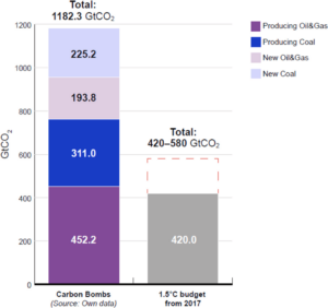 The emissions potential of the 425 carbon bombs is roughly double the remaining carbon budget for staying under 1.5oC. If we were to abandon the projects that have not yet started to produce coal, oil or gas, we would eliminate over a third of the total emissions potential of these projects.