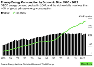 ‘New data spotlight high energy demand in developing economies. OECD energy demand peaked in 2007, and the rich world is now less than 40% of global primary energy consumption’ says Bloomberg News. Phew, I don’t need to worry about my energy use then!!