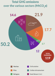 The largest source of emissions (just over 40%) has arisen from the destruction of civilian infrastructure and the reconstruction that this has necessitated. Reconstruction and its associated emissions will continue long after physical hostilities have ended.