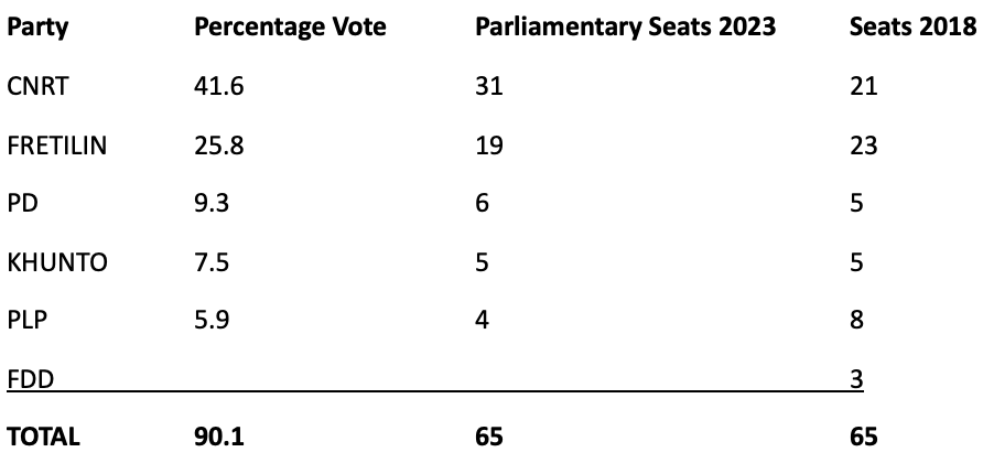 Gusmão’s National Congress for Timorese Reconstruction (CNRT) had an historic high 41.6 per cent vote in the May 21, 2023, parliamentary elections. Winning 31 seats in the 65-member parliament, CNRT formed a parliamentary majority with the support of the Democratic Party (PD) which won 6 seats.