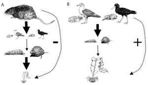 The explanation for this is that before the rat invasion the shorebirds were the apex predators on the rocky intertidal areas (Figure B below). They controlled the populations of the invertebrates, including those that eat fleshy algae. The scientists call this a three-trophic level ecosystem (birds eat invertebrates that eat algae).