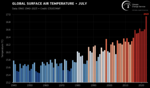 The top graph vividly demonstrates the steady increase in mean global temperature in July between 1939 to 2023. This is a measure of the surface temperature all around the world, over land and sea. Nothing much changed between 1940 and 1980 but since then it’s been pretty much one way traffic, with July 2023 being 0.32oC higher than the previous peak in 2019.