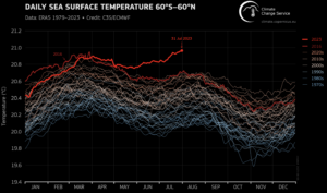 The second graph displays the average daily sea surface temperature between 1940 and 2023. The last four months stand out as being well above recent years, which themselves were much warmer than previously.