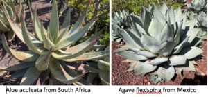 Nor was I aware that despite their very similar appearances the agaves of the Americas and the aloes of Africa (both are ‘leafy succulents’) have developed quite separately – an example of parallel evolution. This is also true of ‘stem succulents’, the cacti of the Americas and the euphorbias of Africa.