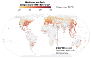 If you are struggling to get your head around the concept of wet bulb temperature, at what level it becomes dangerous for human health and survival, and what can be done to combat high wet bulb temperatures, an article in Nature provides more details, including research being conducted at the University of Sydney to explore how varying levels of temperature and humidity affect heart and kidney function. The map below displays maximum wet bulb temperatures in recent decades.