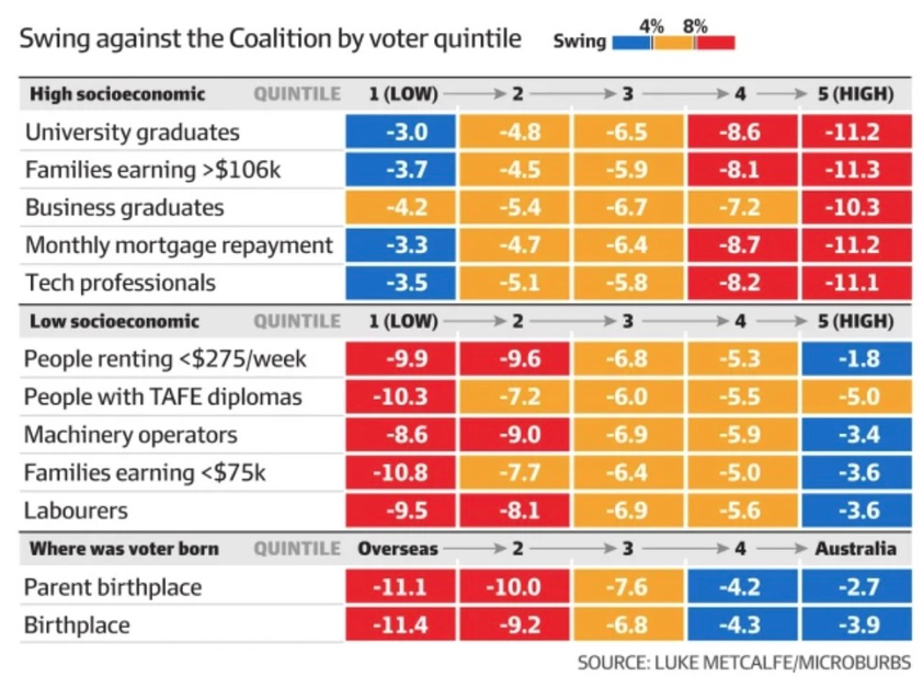 The same pattern can be seen in both the 2019 and in particular 2022 elections. In the 2022 election it is clear that the strongest swings against the Coalition were in the districts with a high proportion of university graduates and top quintile income levels. However, those in the bottom socio-economic quintile with a diploma level or no qualifications also swung strongly against the Coalition. Conversely “tradies” with higher income levels had among the lowest swings away from the coalition. Districts with higher proportions of first and second generation migrants swung strongly against the Coalition, while those with a higher proportion of third generation (predominantly Anglo-European) Australians didn’t move as strongly against the Coalition. Women and younger Australians moved more strongly against the Coalition than men and older Australians.