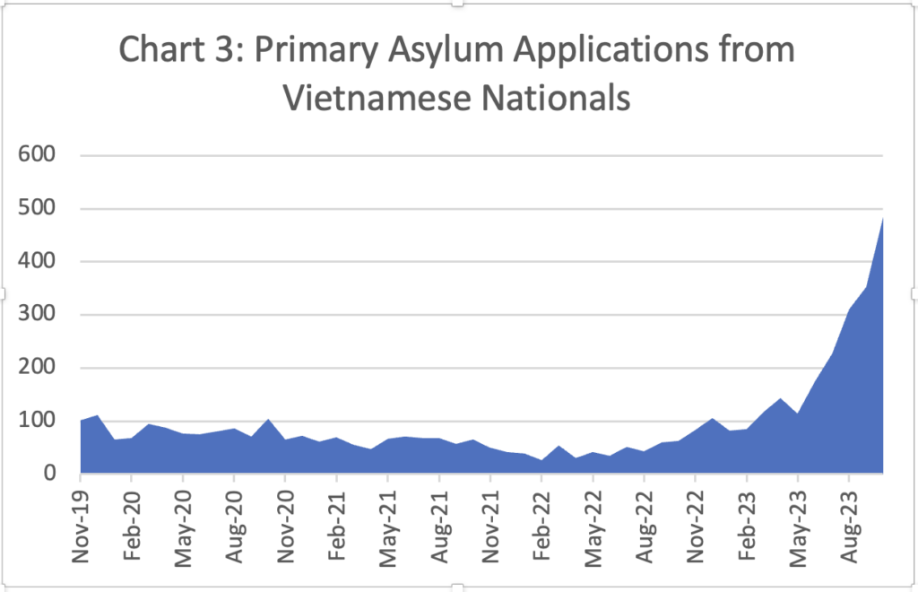 In October 2023, only 77 primary asylum applications from Vietnamese nationals were finalised, with a zero approval rate. In September 2023, 86 primary asylum applications from Vietnamese nationals were finalised also with a zero approval rate.