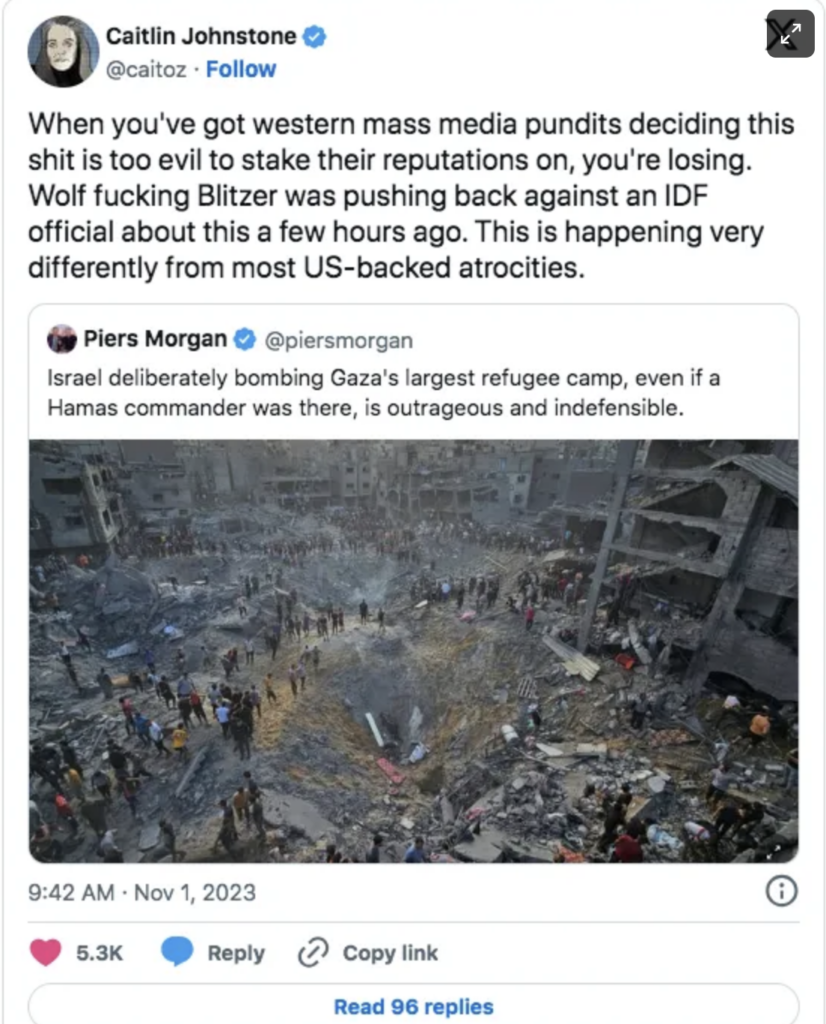 And this is like if everyone was watching the Iraq invasion online in real time, with raw footage of all the civilians it’s killing flooding their social media feeds 24/7. There’s only so much propaganda spin you can put on that.