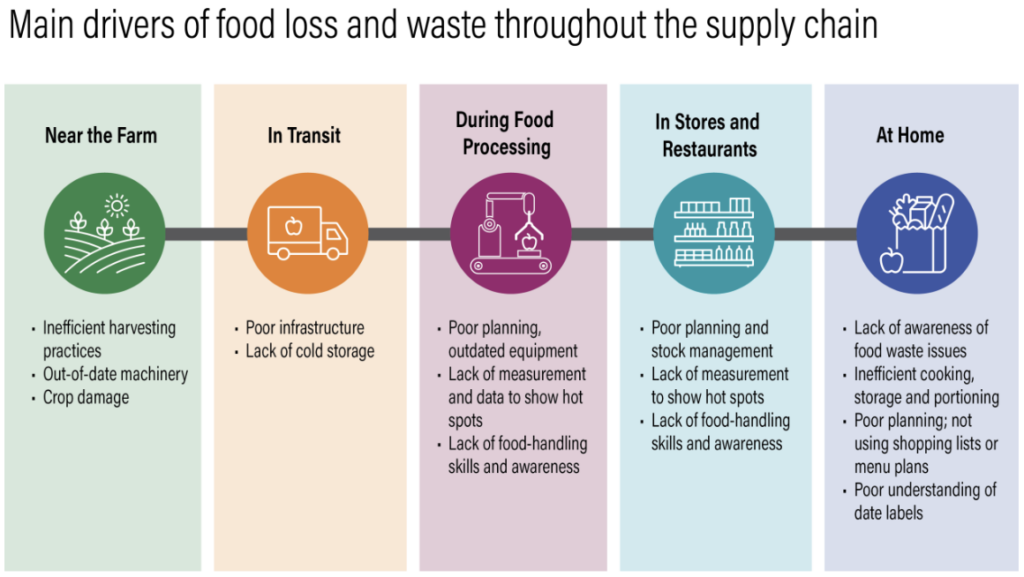 Food loss occurs in the supply chain from farm to warehouse and might be caused by inadequate equipment, transport systems, technology or packaging. Food waste occurs at the retailer and after sale and might be due to poor stocking, inadequate food preparation skills or consumer behaviours (wanting only perfect looking fruit, say, or confusion about sell, best and use by dates).