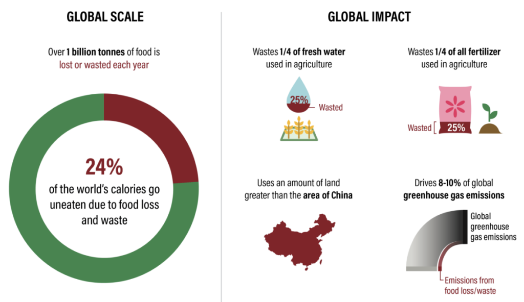 One-third by weight and a quarter by calorie content of all food produced globally is lost or wasted between ground and gums. Yet 10% of the world’s population are malnourished. Lost and wasted food costs the global economy US$1 trillion every year.