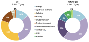 The sources of the emissions from the oil and gas production lines are shown in the two pie-charts below. Fugitive and vented methane accounts for almost half of all the GHG emissions from oil and gas operations. The ‘Energy’ category below refers to the power required for the drilling rigs, pumps, equipment and heat that are required to get the oil and gas to the surface.