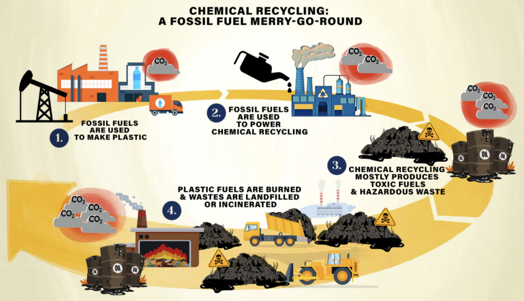 On top of that, there are serious problems with the whole idea of chemical recycling: the hundreds of chemicals, many toxic, contained in new plastic products; multiple past failures to make the technologies work; public health risks from the toxic chemicals and heavy metals produced during the recycling process; and the costs involved in the collection, sorting and processing. Unfortunately, producing new plastic is cheaper.