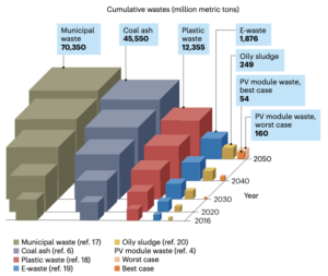 But No, we aren’t going to be submerged in a sea of decommissioned solar panels. As the figure below demonstrates, currently and even in 2050 the waste from photovoltaic modules will be very small compared with municipal waste and the waste generated by fossil fuel production. This is largely a result of the rapidly increasing lives of solar modules and more reuse and recycling.