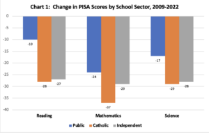 Catholic and independent schools had the biggest declines in the OECD’s Programme of Student Assessment (PISA) test results since 2009. Their students lost 1½ to nearly two years of learning in reading, mathematics and science. The falls in test scores were far bigger than for public schools.