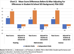 The report adjusted the raw PISA scores for difference in the SES composition of the school sectors. It found that public schools outperform Catholic schools after adjusting for differences in the socio-economic status (SES) of students and schools. The adjustment shows that public school results exceeded that of Catholic schools by 13 points in reading, 17 points in mathematics and 15 points in science [Chart 2]. The differences amount to more than six months of learning.