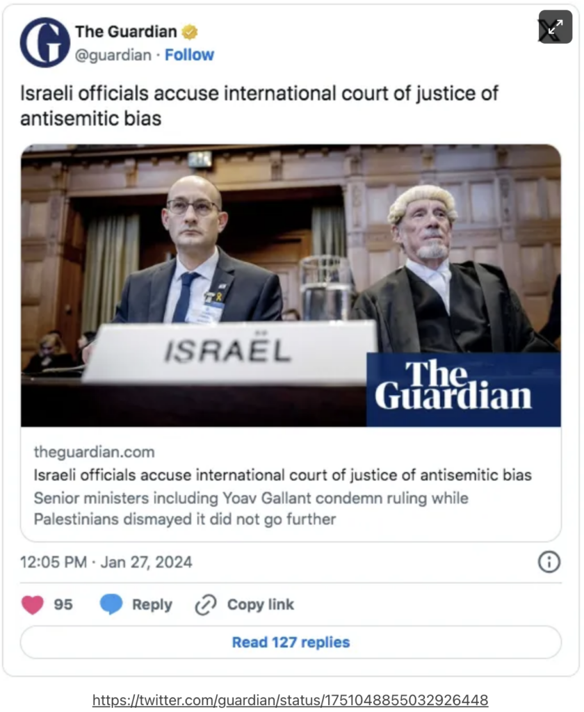 Imperial media are aggressively emphasising the absence of a ceasefire order in their headlines and many Israel apologists are framing that absence as a victory for their favorite ethnostate, but such performative chest-thumping is severely undercut by the way high-level Israeli officials are currently accusing the ICJ of antisemitism and saying Israel should ignore its rulings.