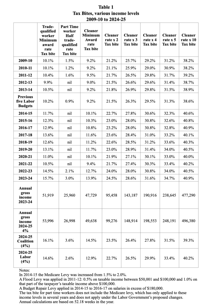 But this middle Australia is not low income Australia, where bracket creep has reduced living standards, where the Government’s response is lacking, and where the tax bite on low incomes will continue to grow. The tax bite on the cleaner’s income in 2024-25 is estimated to be 12.9%. If that income increases by 10% over the following three years, for example, we know, using the ATO’s tax calculator, that the tax bite will increase to 14.0%. The inequity of the past decade will become baked in unless the situation is exposed and some action is taken.
