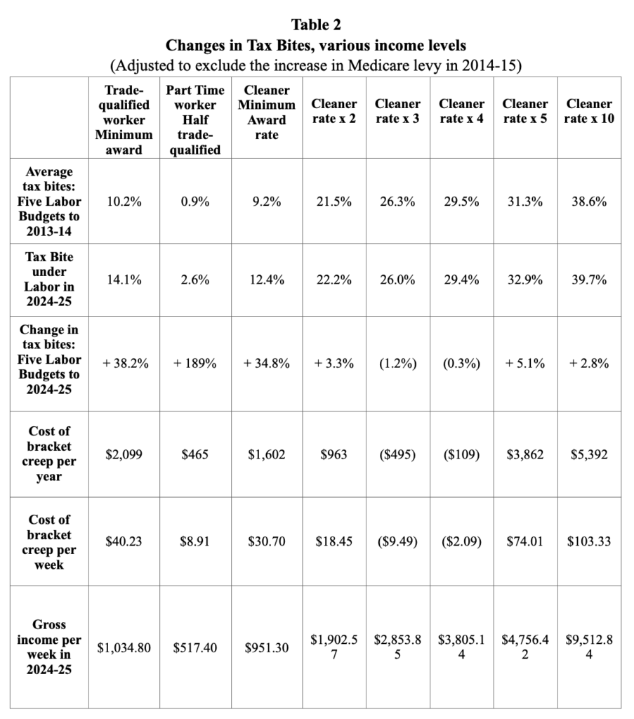 Table 2 demonstrates the substantial losses that low paid to middle income workers have suffered as a result of bracket creep, even after Labor’s current proposals for the tax system.