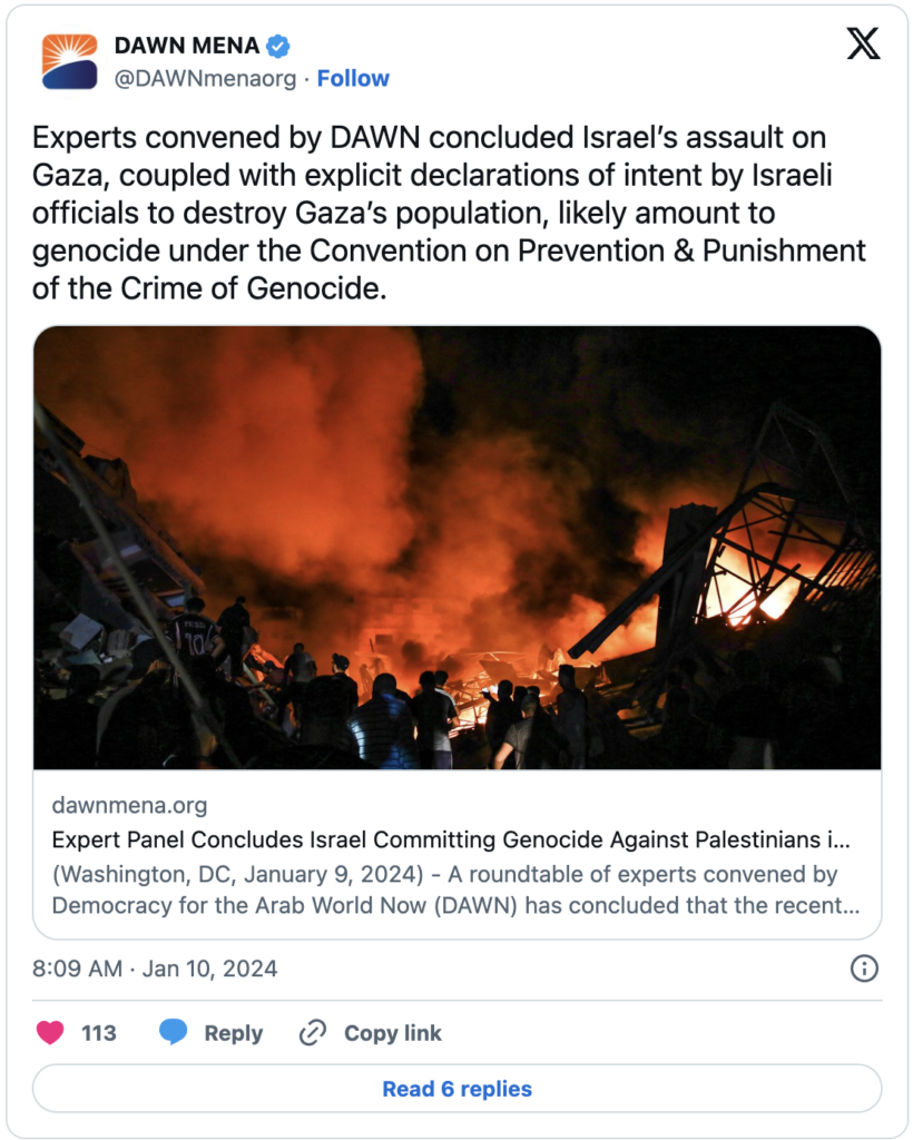 “Expert analysis of Israeli government statements revealing their intent to destroy Palestinians in Gaza, combined with military actions on the ground, including mass killings, forced displacement, and the deprivation of items essential to life in Gaza, suggest that the crime of genocide is being committed against the Palestinian population,” Sarah Leah Whitson, DAWN’s executive director, said Tuesday. “South Africa’s charging Israel with genocide before the International Court of Justice underscores the need for decisive international action to compel a cease-fire and hold the perpetrators of these atrocities accountable.”