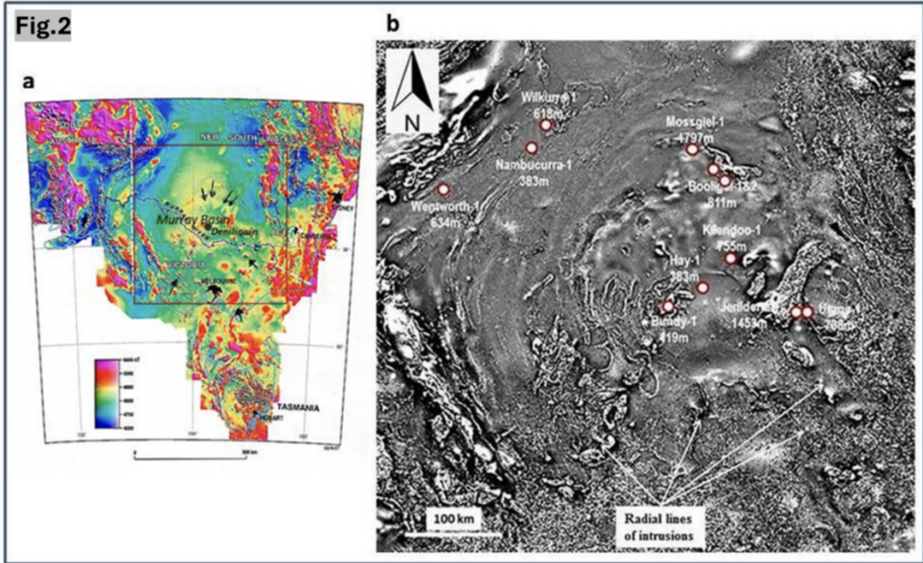 Figure 1. A. Location of the Deniliquin structure in southwestern New South Wales; B. Total Magnetic Intensity image (TMI) of the Deniliquin multi-ring structure, southern New South Wales ( Glikson and Yeates, 2022);