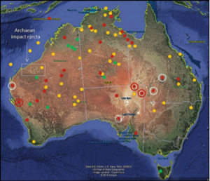 Gondwana precursor have been the target of numerous asteroid impacts, including at least 38 confirmed and 43 potential impact structures (Figure 2), including partly to completely buried root zones of large impact structures, cf. Woodleigh (diameter 120 km), Gnargoo (d75 km), Mount Ashmore (d>50 km), Talundilli (d84 km) Tookoonooka (d55 km), Warburton East (d200 km). Warburton West (d200 km) and Acraman (d<90 km) (