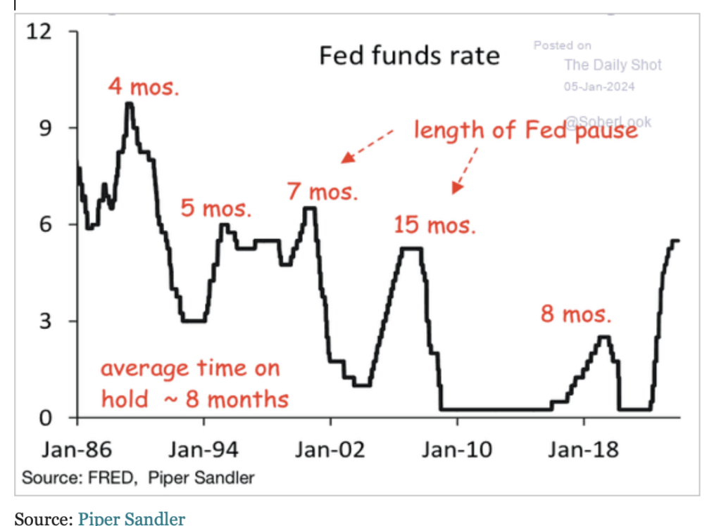 Another finding is that Fed rate cuts happen on average five months after the last rate rise. On that reasoning the Fed should have cut its rate by the 26 December 2023 assuming its rate rise to 5.25% to 5.50% on 26 July was its last. But that did not happen.
