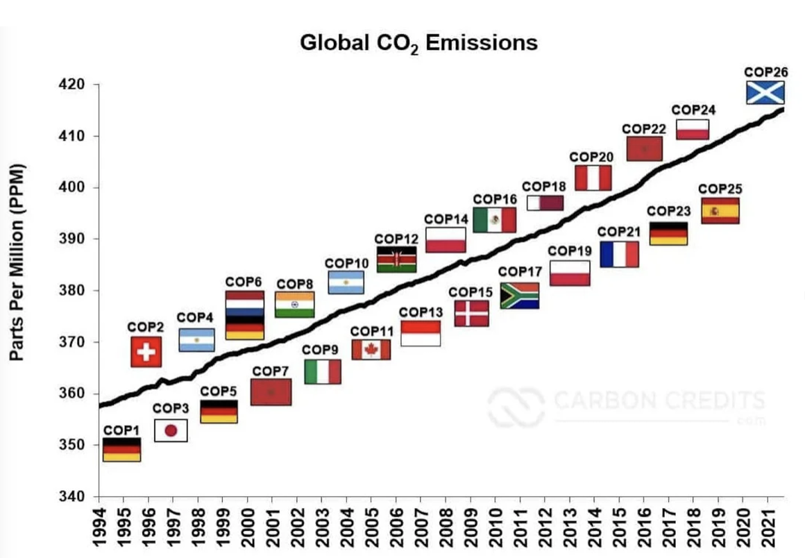 The second illusion was that there was any realistic hope of keeping warming to 1.5°C or even 2°C, given the decades of policy-making failure (see image), emissions breaking new records year after year, the reduced levels of aerosols which are masking warming, the political inertia rooted in adherence to a slow, economically non-disruptive mitigation path, and in particular state capture by the fossil fuel industry, allowing fossil fuel expansion. Many of us, including some leading scientists, have been warning for a long time that the world would flash past 2°C and into the existential 3-4°C range given the failure to treat climate change as the single greatest threat to humanity, and respond accordingly.