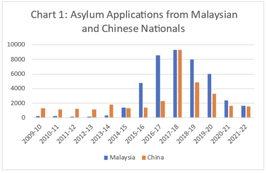The real issue from a border protection perspective is not the tiny number of boat arrivals but the fact we now have almost 110,000 asylum seekers living in Australia with little to no chance of being recognised as refugees. That started in 2015 when we saw the biggest labour trafficking scam abusing the asylum system in our history (see Chart 1). The scam started with Malaysian nationals and quickly spread to Chinese nationals. The scam peaked in 2017-18 when almost 28,000 asylum applications were received, with 67 percent from Malaysian and Chinese nationals.