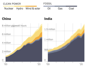 In between, we see vastly different trends. Developing countries, large and small but well exemplified by China and India, have been increasing their electricity generation rapidly and while still heavily dependent on coal have also been increasing their renewable energy supply.