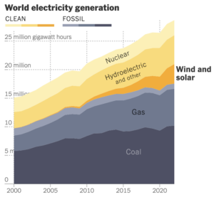 Electricity is unique to and the central ingredient of advanced industrial societies. In 2022, approximately 27 million gigawatt hours of electricity were generated globally, a staggering 80% increase since 2010. Coal, gas, hydro, wind and solar all contributed to the increase, while production from oil and nuclear remained roughly constant.