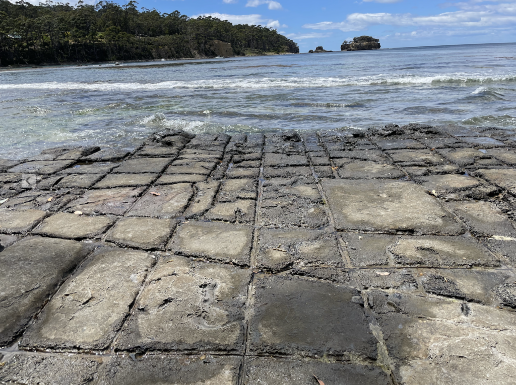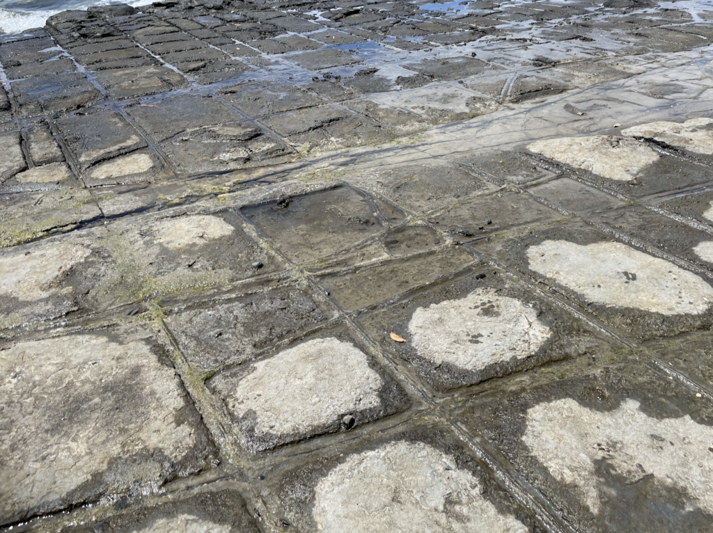 The actions of the tides and sea water have created tiles with two different exposed surfaces: ‘loaf’ formations where the edges have been rounded off and ‘pans’ where the centre has eroded down.