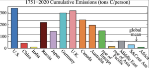 The responsibility for the dire situation we are in is driven home by the third figure which shows cumulative fossil fuel emissions per person from 1751 to 2020. The USA, Canada, Europe, Russia, Australia and Japan should all hang their heads in shame at their continued merciless refusal to accept full financial or moral responsibility for their past emissions.