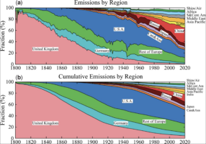Three of the figures in the somewhat technical but important Hansen et al paper that I discussed three months ago are reasonably comprehensible to the general reader. The first two below show the annual and cumulative fossil fuel-related CO2 emissions by country or region as a percentage of the global CO2 emissions from 1800 to 2020. The UK may be industrially diminished these days but it’s clear where the industrial revolution started and that Europe and the USA are still responsible for over a quarter of current emissions and over half of all emissions to date.
