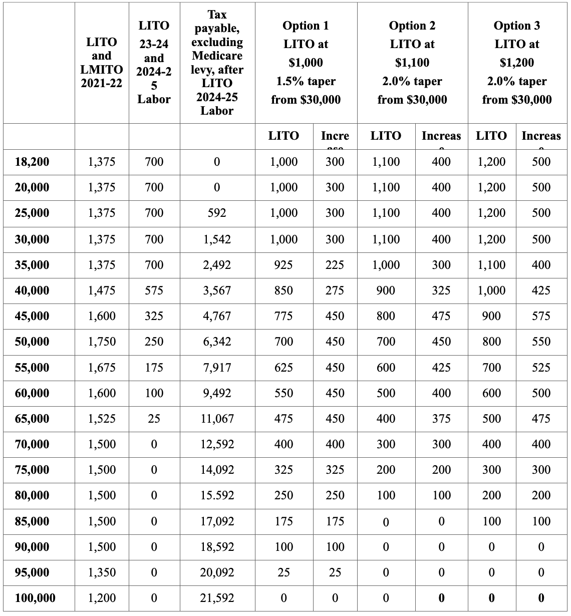 The following table contains three increases in LITO, increasing it to $1,000, $1,100, and $1,200. Each has the full amount being payable at $30,000. In the first option the phase-out, or taper, rate is 1.5%, in the latter two it is 2%. At $50,000 the annual increase in after-tax income is valued at $450, $450, and $550, respectively.