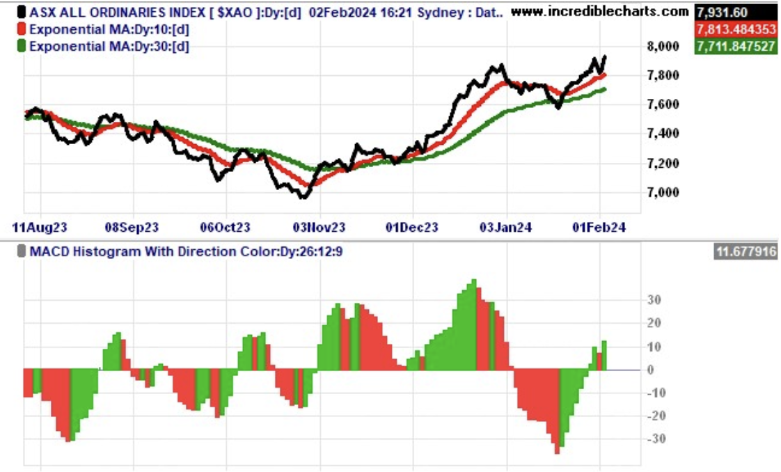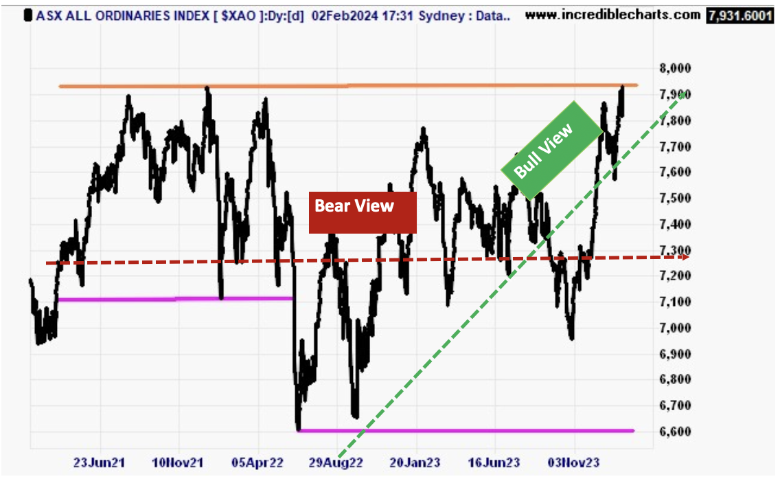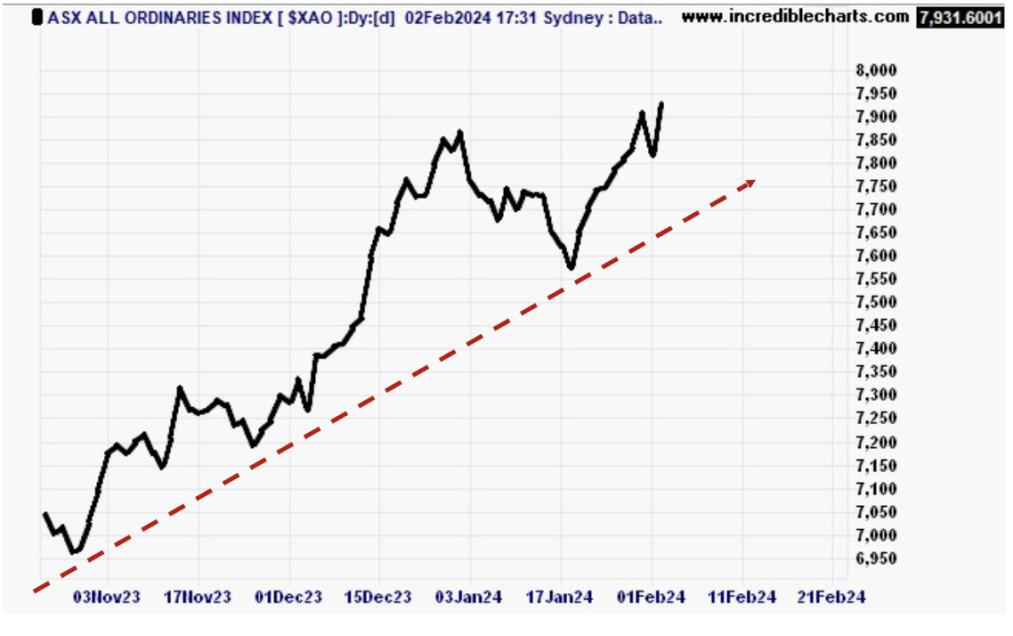 Last Friday 2 February 2024 the All-Ords reached a record high (7931.6) beating its previous high on the 4 January 2022 (7926.8). If the index keeps rising it will show it has broken out of its previous range bound yoyoing.