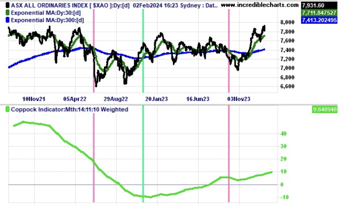 - The Coppock momentum indicators of both markets are positive. They turned up in negative territory early last year signalling the previous bear market was over.