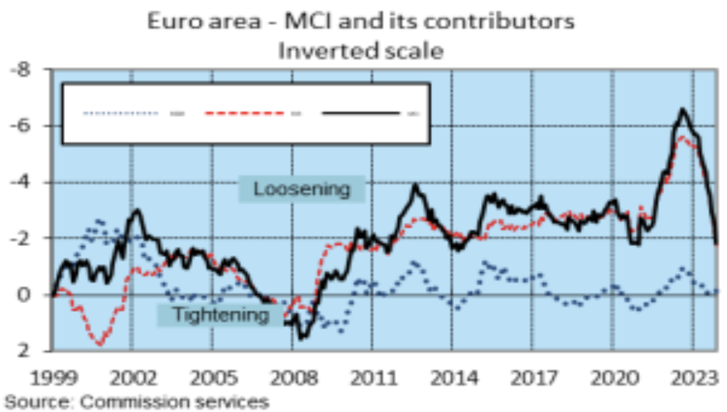 Europe too has loose financial conditions, but they have sharply tightened since the end of the September quarter 2023. Bears say that if this continues it could trigger a recession and depress corporate earnings this year. See next chart.