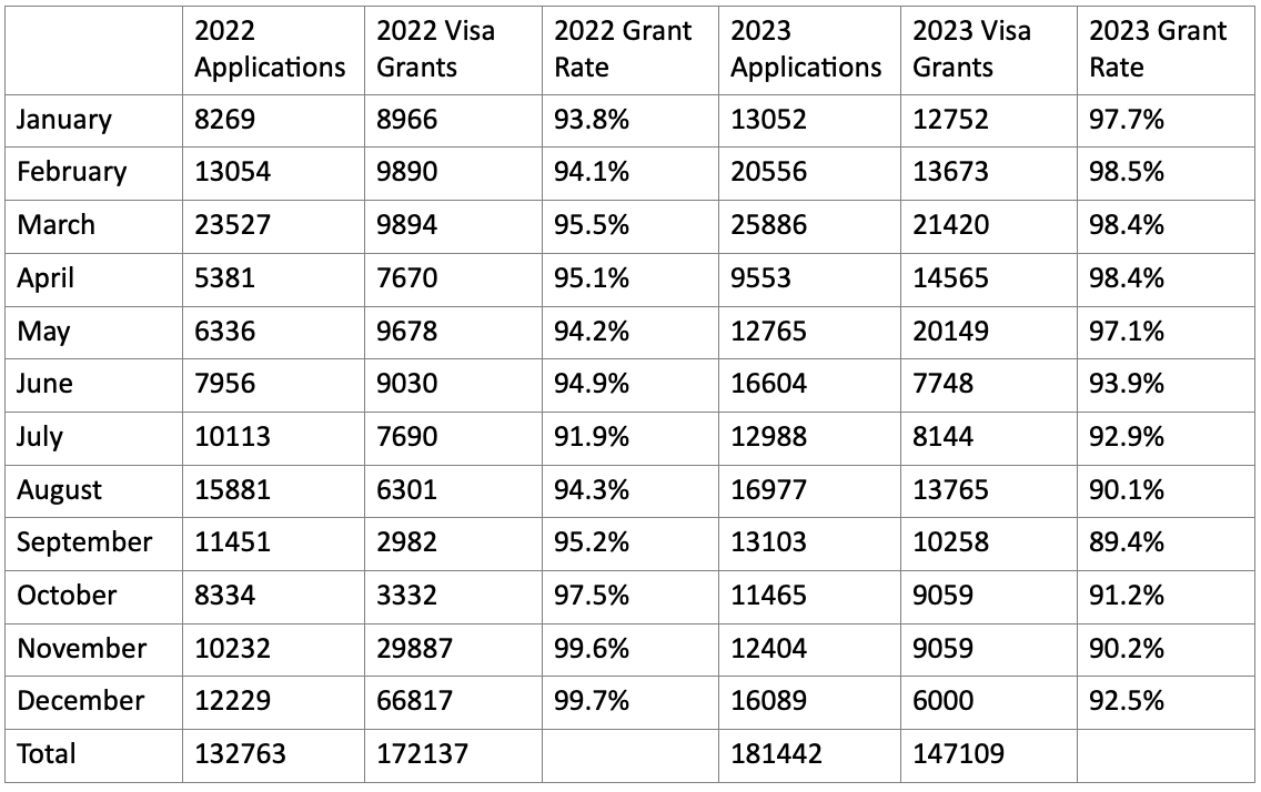 From June 2023, onshore student visa processing has largely gone back to what might be described as normal with a grant rate of between 90 to 95 percent. But it also appears the backlog is again beginning to slowly increase. In December 2023, there were only 6,000 grants and 16,089 applications with a grant rate of 92.5 percent. By end December 2023, the bridging visa backlog had again climbed to 211,570. That trend cannot be allowed to continue.
