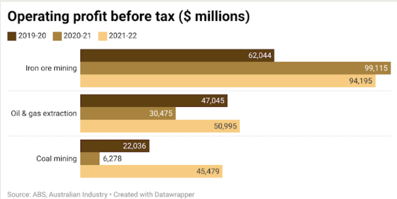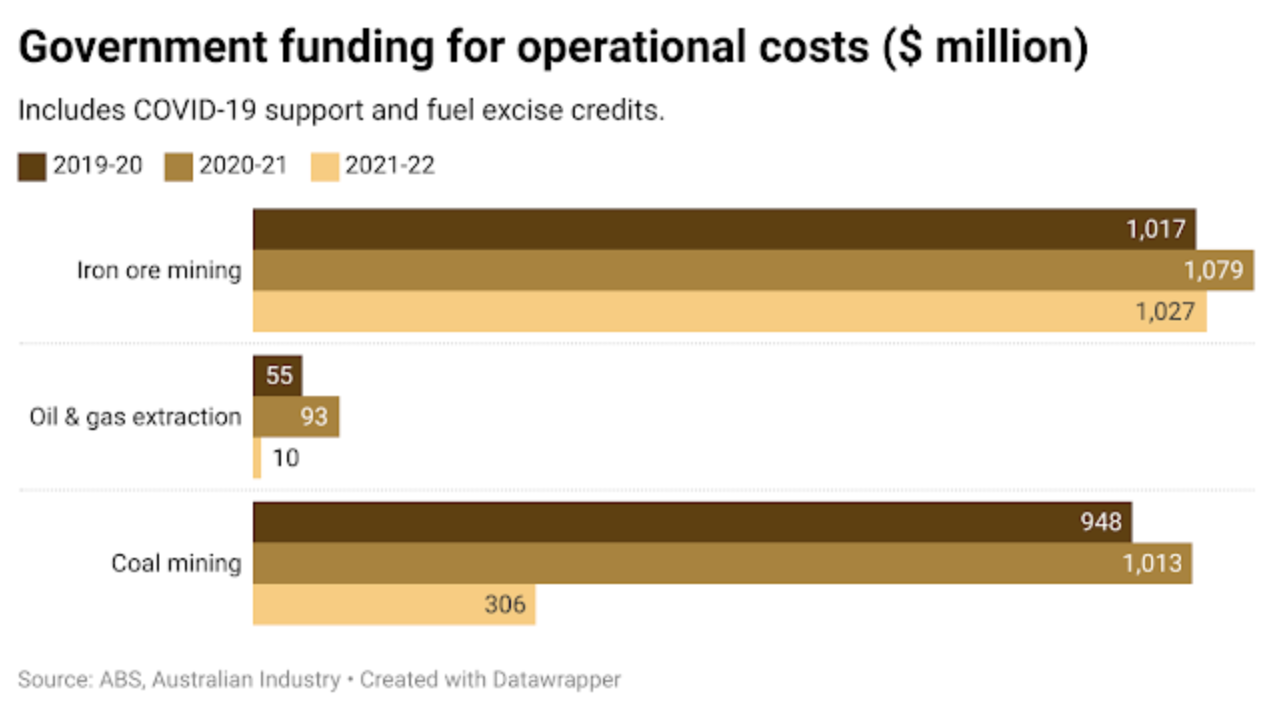 The mining industry also receives substantial government subsidies, such as the fuel excise rebate. The previous federal government’s COVID-19 support, which included the Jobkeeper payments, was remarkably generous for iron ore and coal miners.