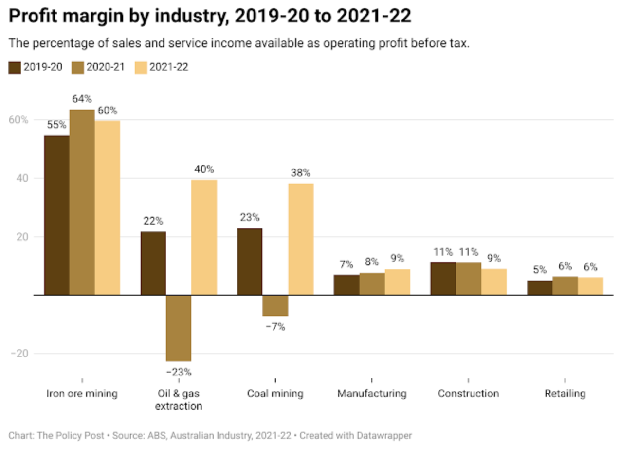 The Australian Bureau of Statistics calculates the profitability of various industries. Profit share is the amount of total income companies are able to retain as profit, after taking expenses into account. As these chart show, the miners are extraordinarily profitable, compared with other industries. Coal, and oil and gas, suffered a single-year’s turndown when the pandemic hit world trade but the iron ore miners did even better than usual.