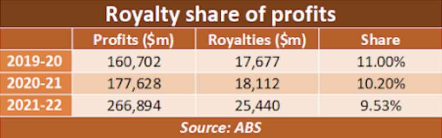 As this table shows, when profits go up, as they did over the three years from 2019-20 to 2021-22, the share going to royalties falls. This has been the story throughout the past 20 years of mineral wealth extraction: proportionately, much more of the increase has gone to companies, not to the public.