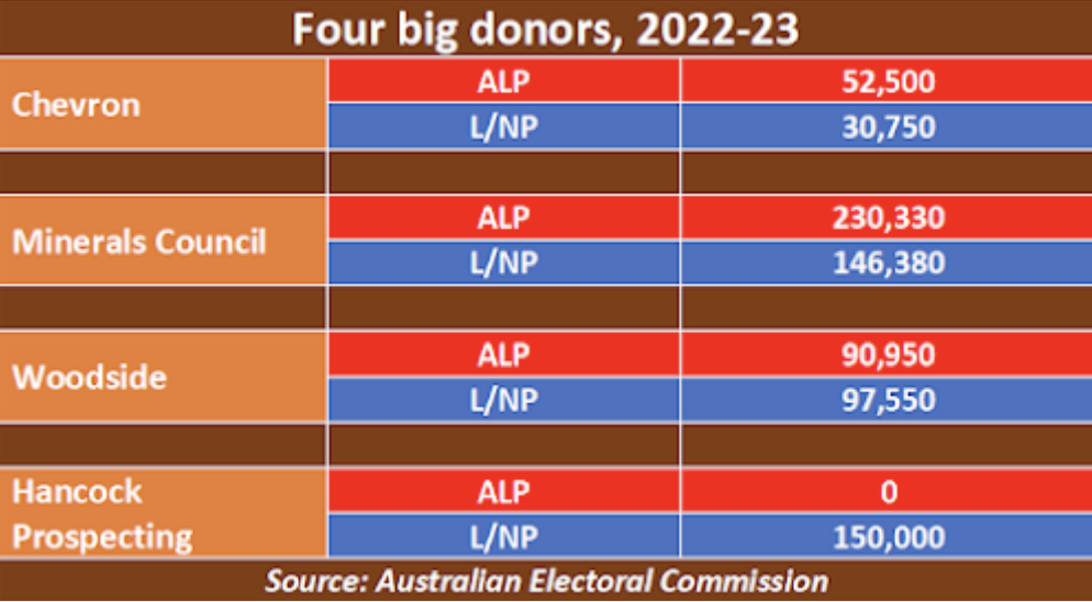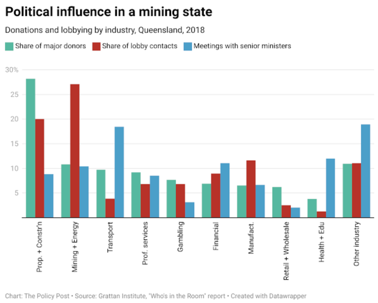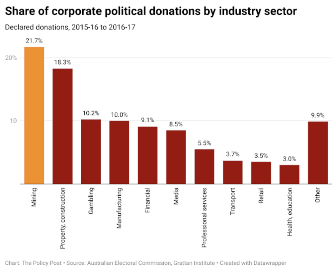 Over a fifth of all corporate political donations come from mining companies, well ahead of the property and construction sector, which is also highly interested in influencing the rules by which it is governed.